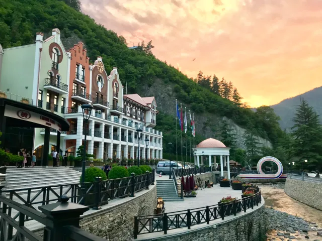 Borjomi is a resort town located in central Georgia, set inside a forested gorge. It developed around natural mineral springs that became widely known in the 19th century. Once the springs gained popularity, Borjomi grew into a health and leisure destination, which explains why parks, walking paths, and open green spaces dominate the town rather than dense historic quarters.