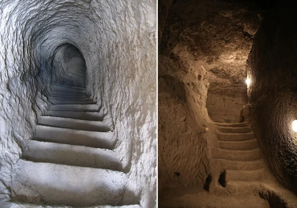 Visitors explore Vardzia entirely on foot, moving upward through carved caves connected by stairs and tunnels. The route passes former living spaces, chapels, and viewpoints.